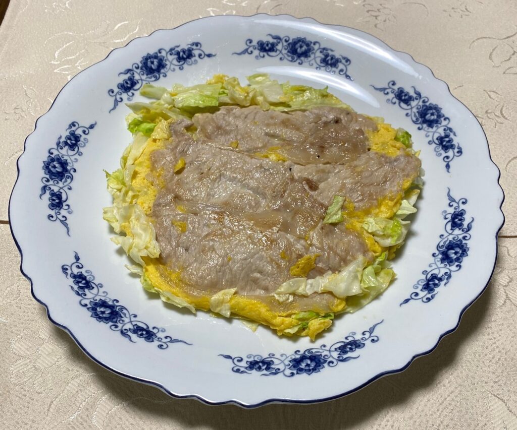キャベツと豚バラ肉を、卵をつなぎにして焼いた料理。単純だがとても美味しい。 大原千鶴さんのレシピ。 お好み焼きのように、1/6くらいに切って食べるのだが、ポン酢しょうゆにつけて食べるところがミソ。実にさっぱりとしてキャベツのうまみ(甘さ)も引き立つ。