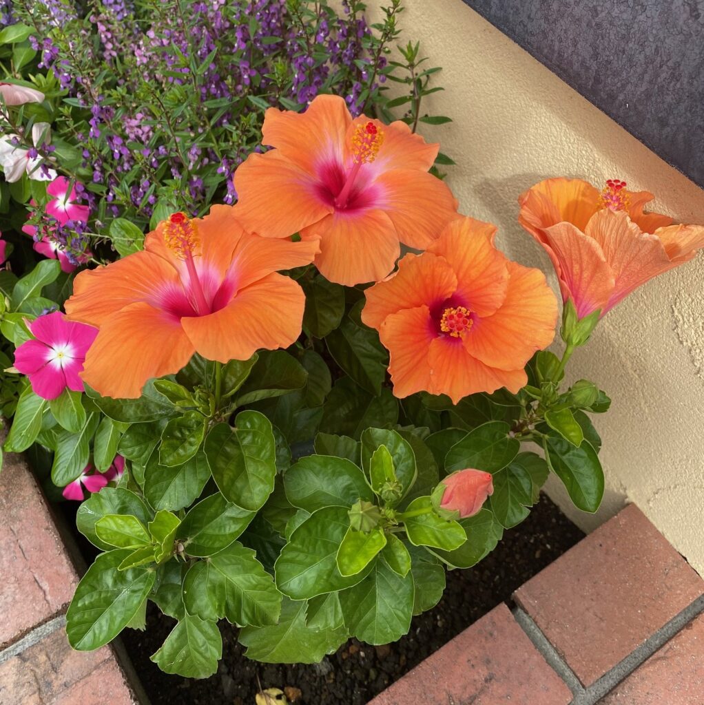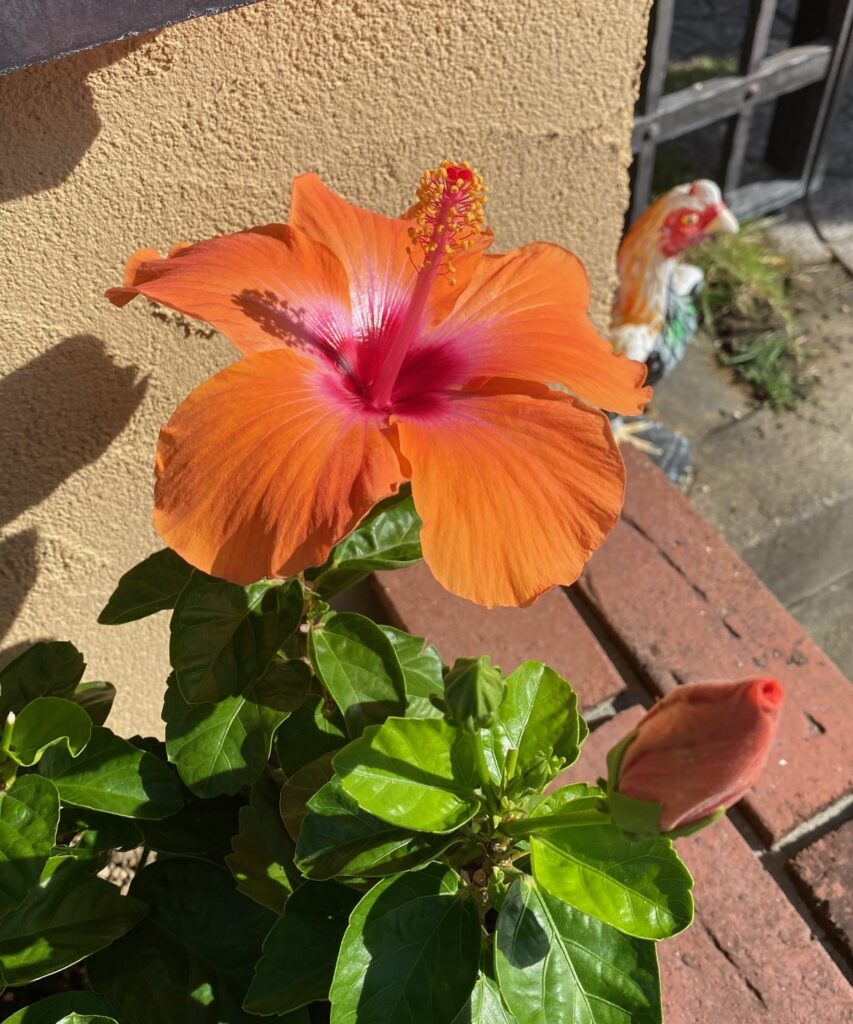 アオイ科。低木。原産地:ハワイ。花言葉 繊細な美、新しい恋。 このハイビスカスは我が家では二代目である。 一代目は下の写真で黄色だった。一代目は植木鉢から地植えにしたら、一年は咲いたが、二年目に木が枯れた。 そこで、オレンジ色の二代目を購入した。 ハイビスカスは真夏に似合い、花が大きく華やかだ。ド派手な感じが好きだ。 ハワイの州花、マレーシアの国花だそうだ。 花は1日しか咲かない。鉢植えでも木は結構大きくなる。