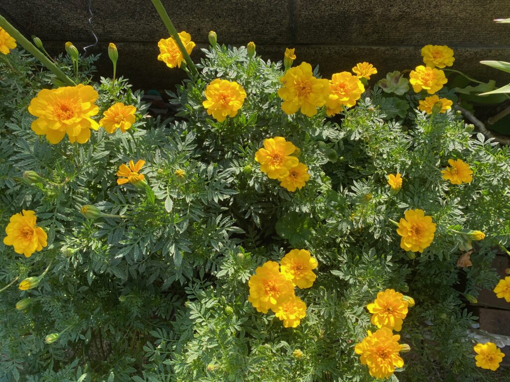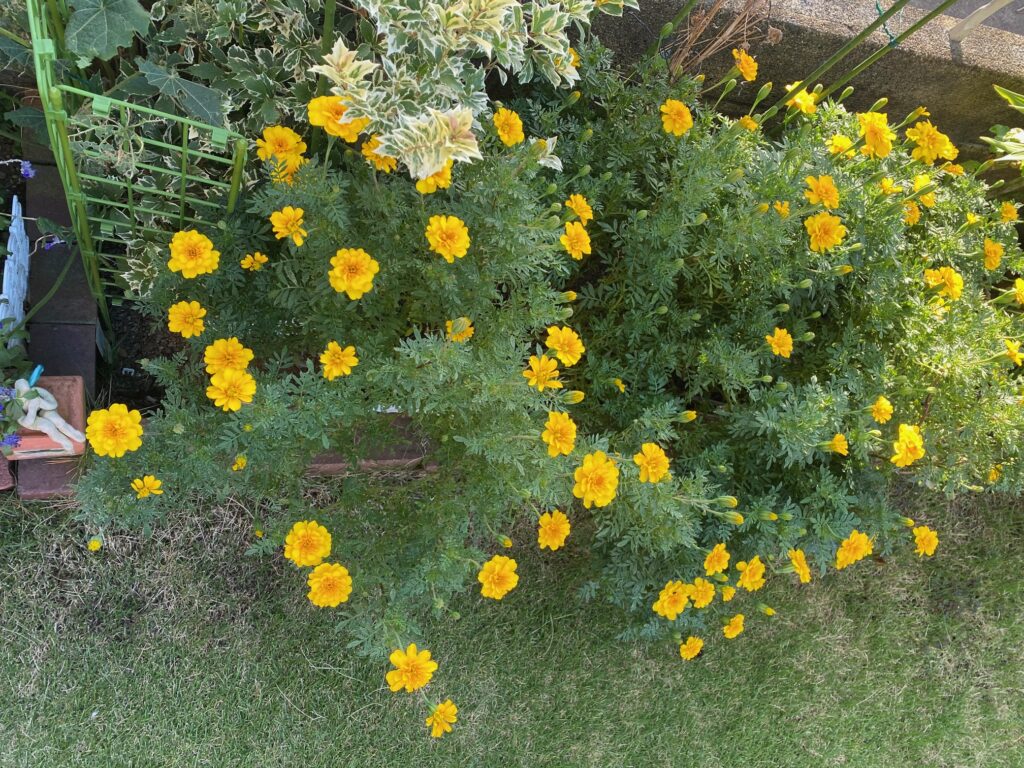 キク科。一年草。花言葉 可憐な愛情、勇者。 名前は「聖母マリアの黄金の花」の意味がある。そこから「可憐な愛情」の花言葉が生まれた。 和名は「千寿菊」「万寿菊」であり、開花期間が長いことに由来する。 私としては夏の花という印象があった。7~8月の盛夏に庭を彩るものと思っていた。しかしながら、2025年は8~9月に花の付かない苗が大きく(60cm)成長し、10月にたくさんの花が咲き誇った。どんな花でも、たくさんの花が咲くと豪華だ。