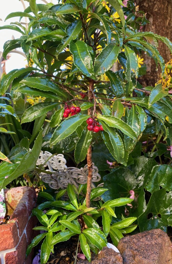サクラソウ科。低木。 花言葉 ことほぎ1)、財産、徳のある人、金満家、慶祝。1)ことほぎ:言葉で祝福する、喜びを言う、祝いのことばを述べる。「言祝ぎ」「寿ぎ」と書く。 原産地は日本。赤い実の木が多いが、白、黄色の実をつける品種もある。 我が家のマンリョウは2代目である。センリョウを植えるか迷った時期もあったが、やっぱり「千」よりも「万」の方がより縁起や金運が良いだろうというさもしい理由でマンリョウを選んでしまった。