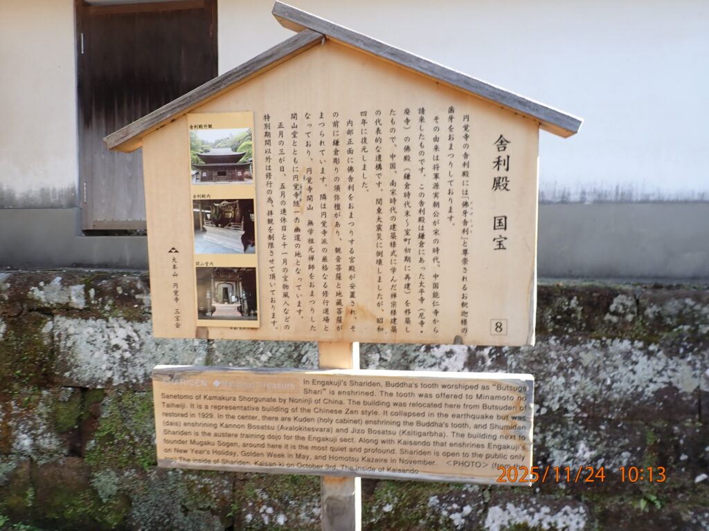 方丈およびその庭園を越えて奥に進むと舎利殿がある。舎利殿は鎌倉時代に宋から伝えられた様式をそのまま残した建物として国宝に指定されている。しかしながら、一般拝観者は離れた位置にある小門から覗くだけで、建物はほとんど見ることができず、何の感興も起こらなかった。舎利殿は昔、切手になったことを覚えている。調べたら30円切手だった。切手の方が建物の様子が分かる。