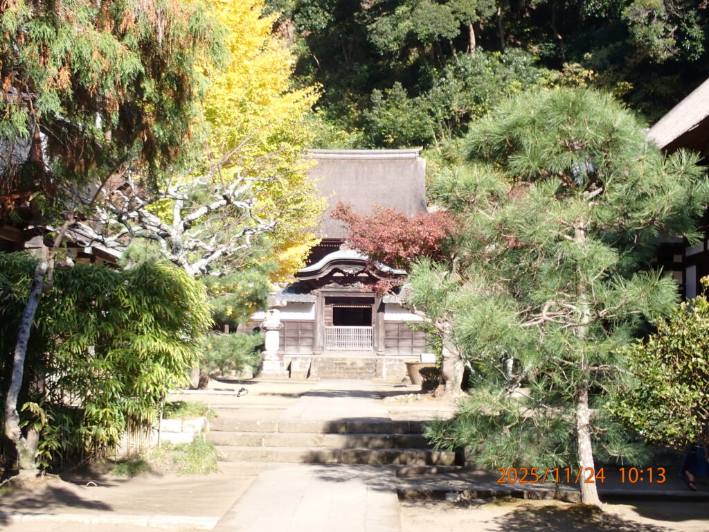 JR横る河川の北鎌倉駅を降りたら直ぐに寺があり、入口の「総門」を入って、まっすぐに進むと、順番に山門、仏殿、選仏場、居士林、方丈、妙香池(みょうこうち)、舎利殿、開基廟(仏日庵の中)とある。仏殿から東南の丘の上に弁天堂があり、ここに洪鐘(おおがね)が置かれている。