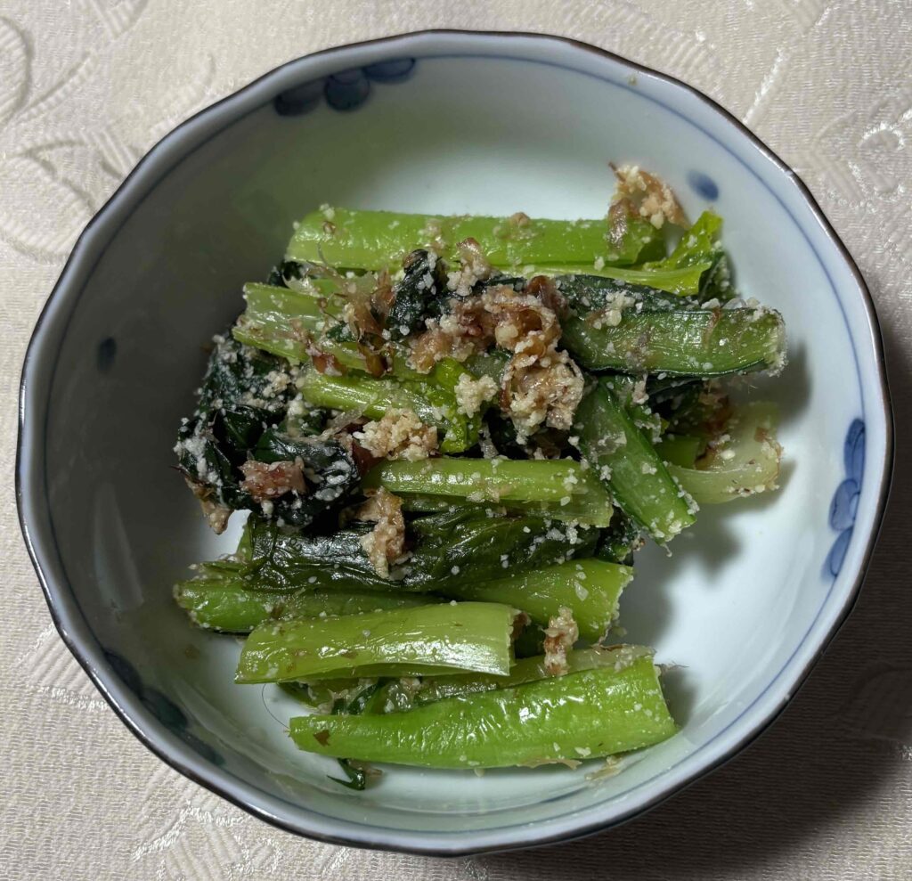 作るのは簡単である。しかし、このような味付けはひとつの発明である。大原千鶴さんのレシピ。 小松菜を普通にゆでる。それに、しょうゆ、粉チーズ、鰹節を入れて混ぜるだけ。 妻も感激した。単なる和風おひたしよりも美味しい。