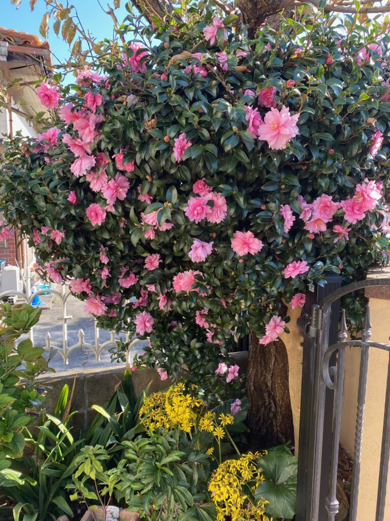 家を建てて直ぐに庭に植えた木は、梅とサザンカだった。サザンカは市から苗木をもらったから植えたのだが、ゴールデンリトリーバーが子犬だった頃に、彼女が若木の幹をほとんどかじり、枯れてしまった。サザンカの花は素敵だったので、2代目を購入して植え、いまに至っている。