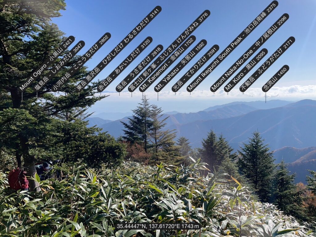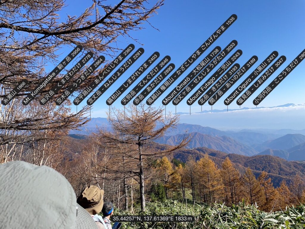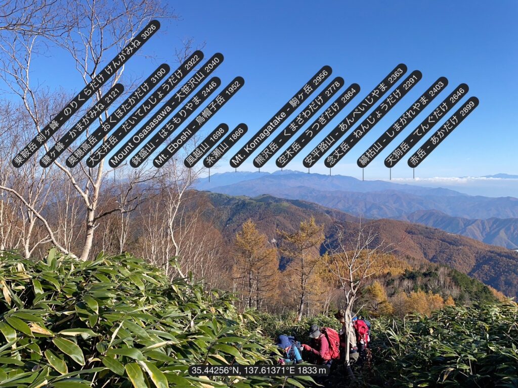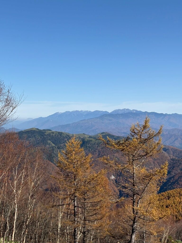 晴天に恵まれ、紅葉が美しかった。また、南アルプス、中央アルプスの山々を眺めることができて、素晴らしい景色を満喫できた。