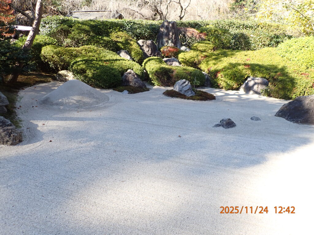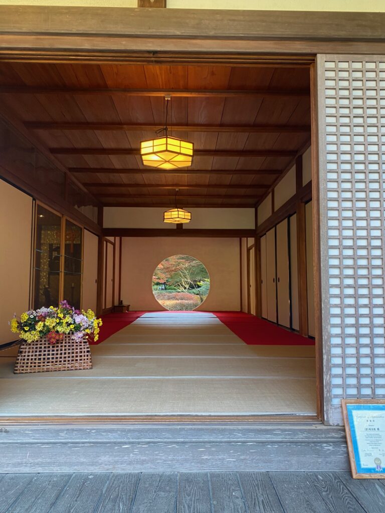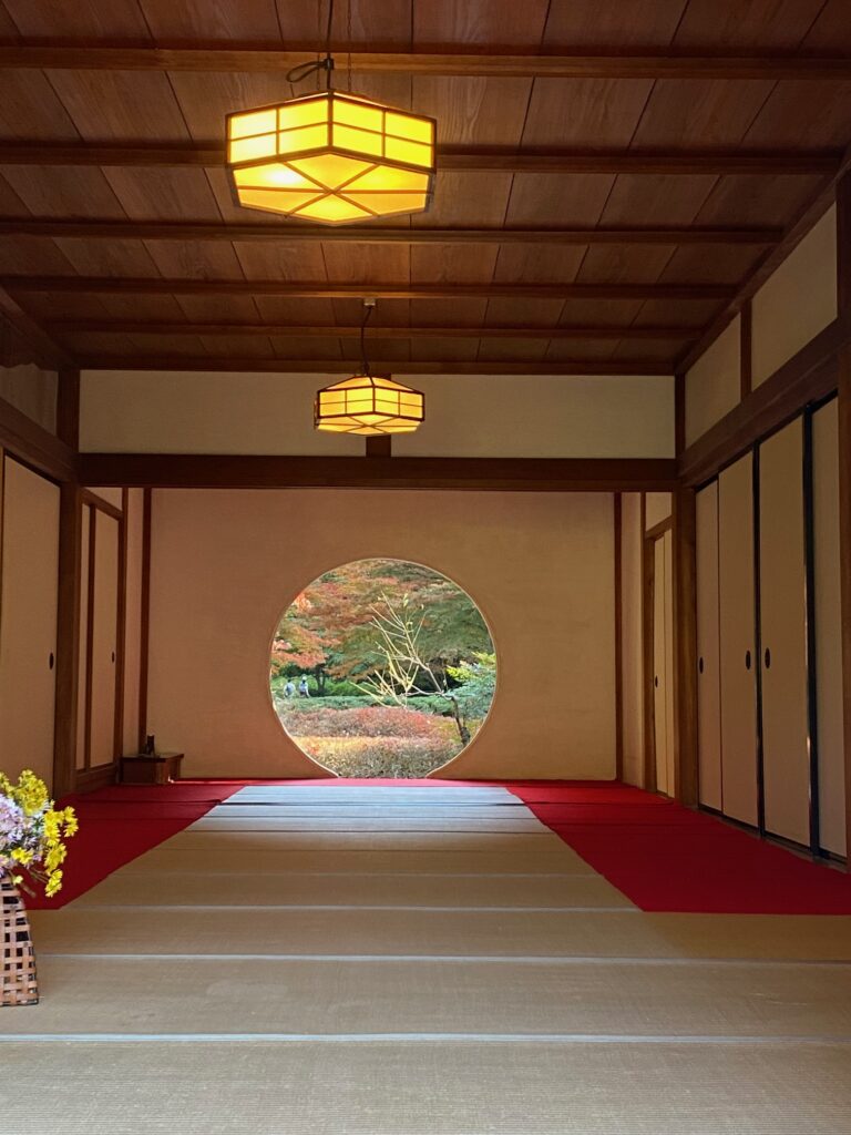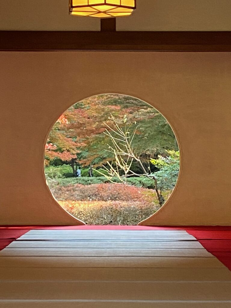 本堂にある丸窓は「悟りの窓」と呼ばれる。窓からは本堂裏手に広がる美しい後庭園が見え、季節によって浮き上がる庭の景色が変化して趣深い。現実には、この窓から庭園を撮るための拝観者が長蛇の列をなしていて、私もじっと耐えて順番待ちした。