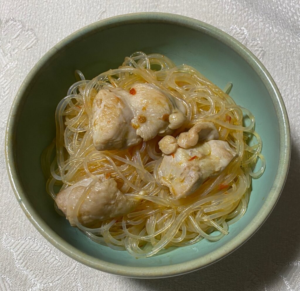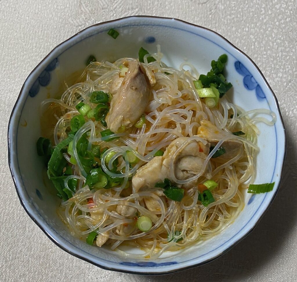チャプチェは春雨、牛肉、野菜等を炒めた韓国料理。韓国では日常的な家庭料理。 大原千鶴さんのレシピで作ったが、肉は鶏肉を使用。本格的な韓国料理とは若干異なる味付けだが、まあまあ美味しい味だった。作り方は極めて簡単。