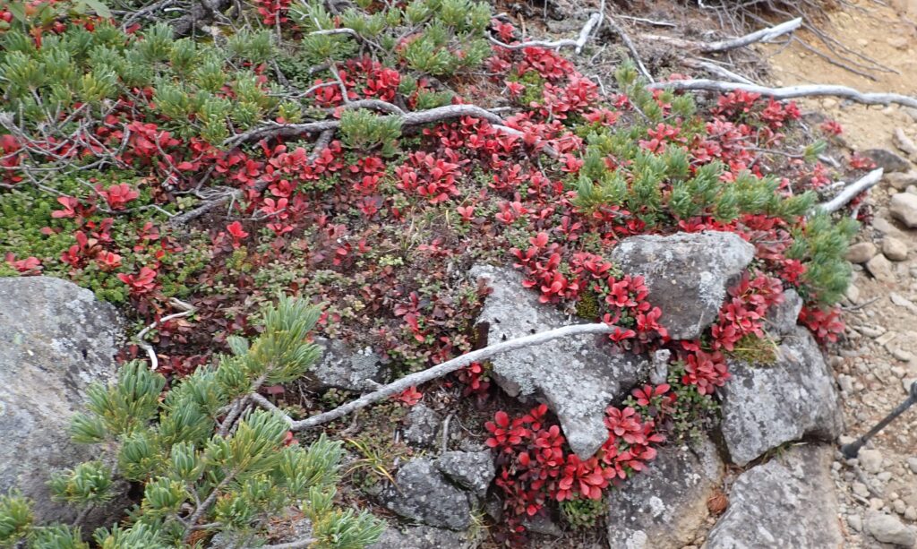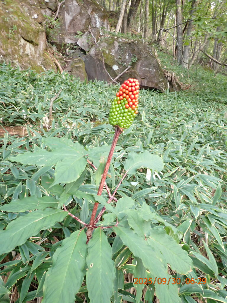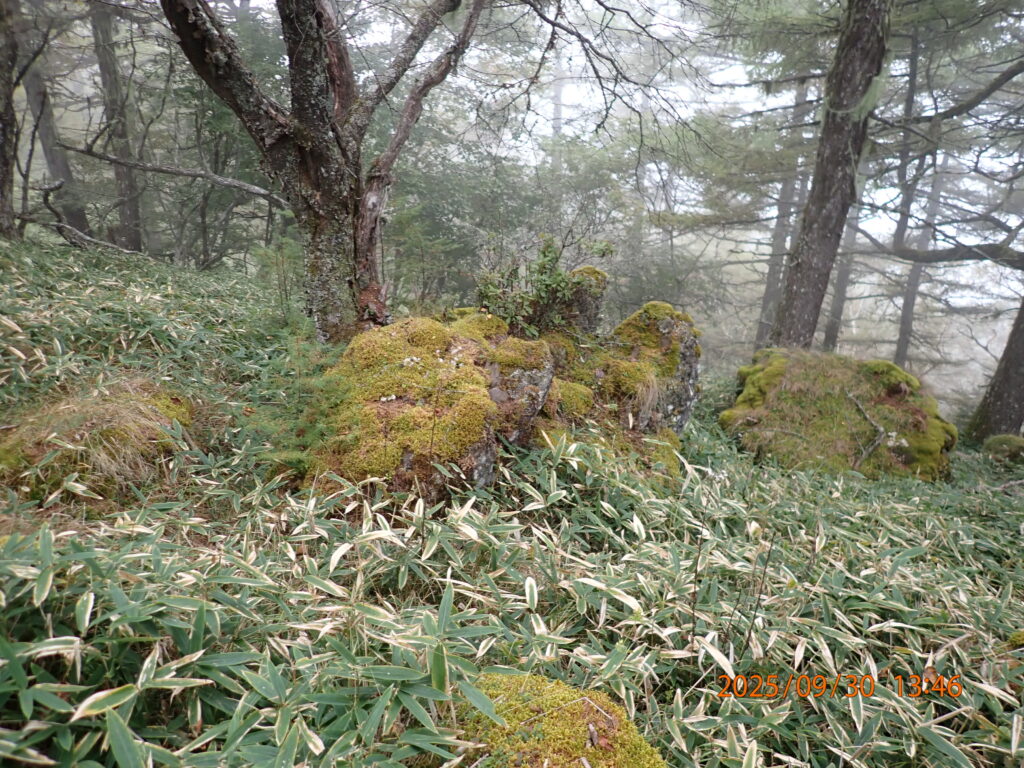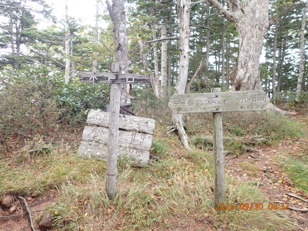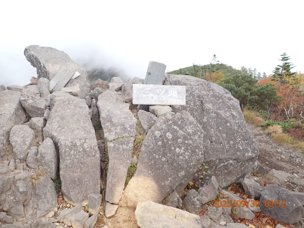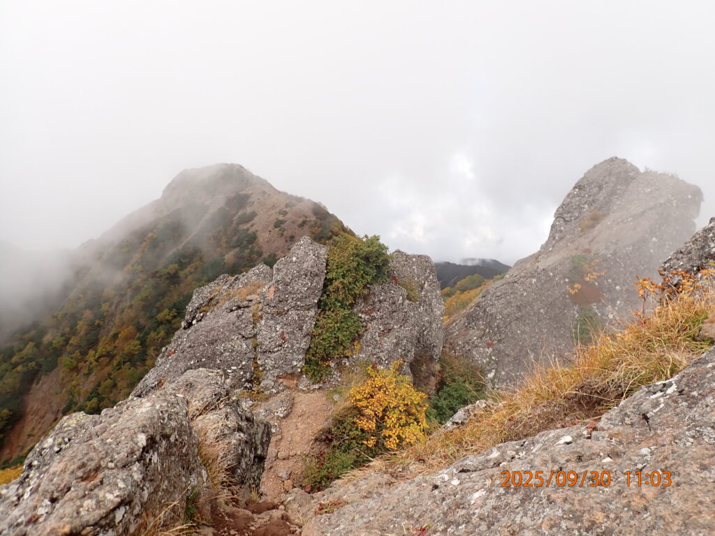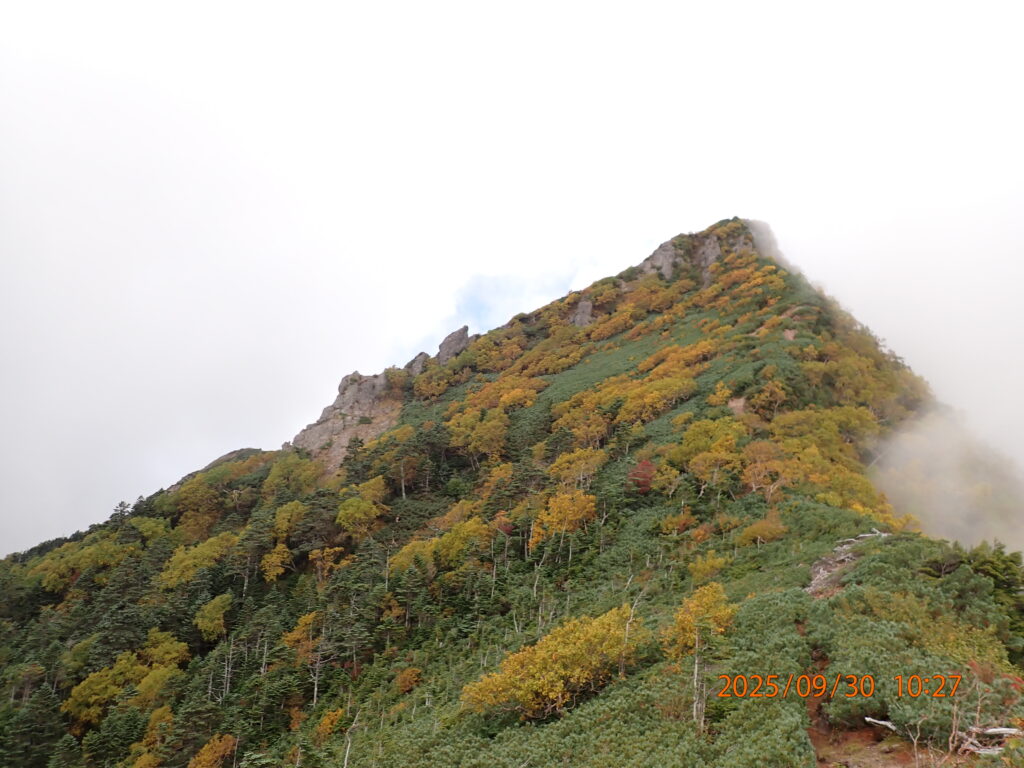 山頂付近ではガスがかかってしまい、雨は降らなかったが、周辺や遠景の山の景色はほとんど見られなかった。しかし、山肌は紅葉が始まっていた。