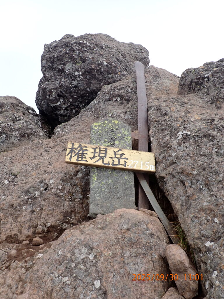 八ヶ岳連峰では、編笠山、阿弥陀岳に次ぐ3番目の山だった。観音平から三ツ頭(2580m)経由で山頂までのピストン登山。古くから山岳信仰の山で、山頂にはお社があり、鉄の鉾*)が立てられていた。