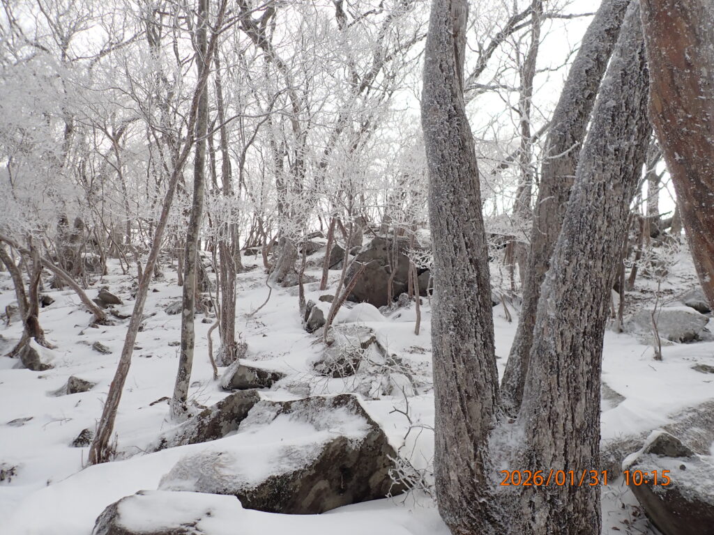 上州で有名な赤城おろし(北西からの強風)が強く、気温も低い(-12℃)中、赤城山の最高峰 黒檜山まで登った。雪はそれほど多くなくて(およそ5cmくらいの積雪)、登山道は人によって踏み固められているので、足が雪に埋まる心配も無かった。