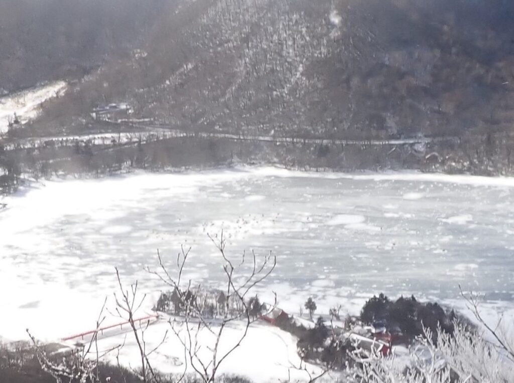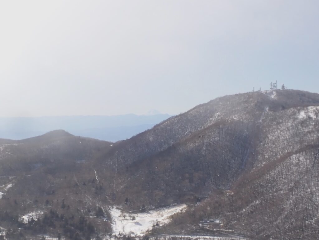 黒檜山から駒ケ岳に行く途中の見晴しが良い場所からは、南は広大な関東平野(群馬県市街地)、東は日光の山々が見えた。また、赤城山の一部である大沼、小沼の全容が眺められた。大沼では湖面の氷上にたくさんの釣り人(わかさぎ釣り)のテントが見られた。沼の氷の厚みは20cmくらいだそうだ。わかさぎは上手な人で100匹くらい釣れるそうだ。