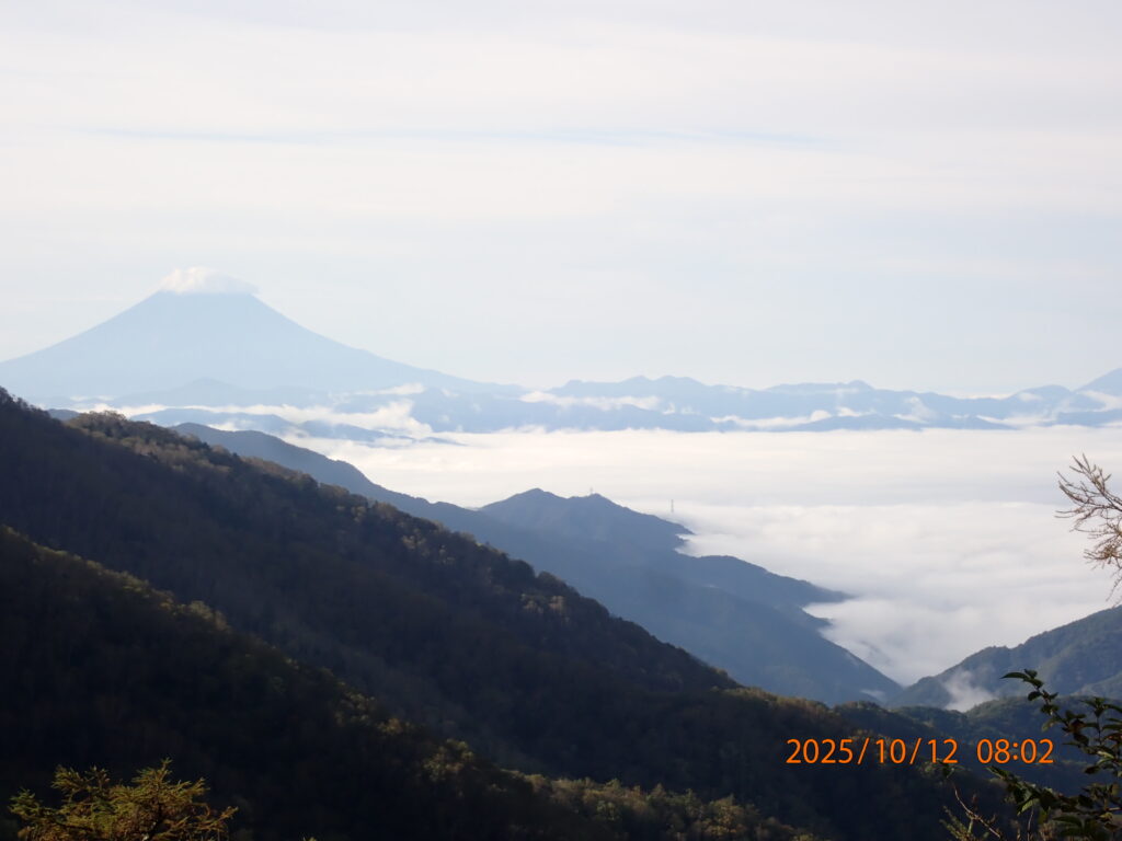 途中で甲府盆地一面に雲海がかかり、その向こうに富士山がそびえる美しい景色に遭遇した。