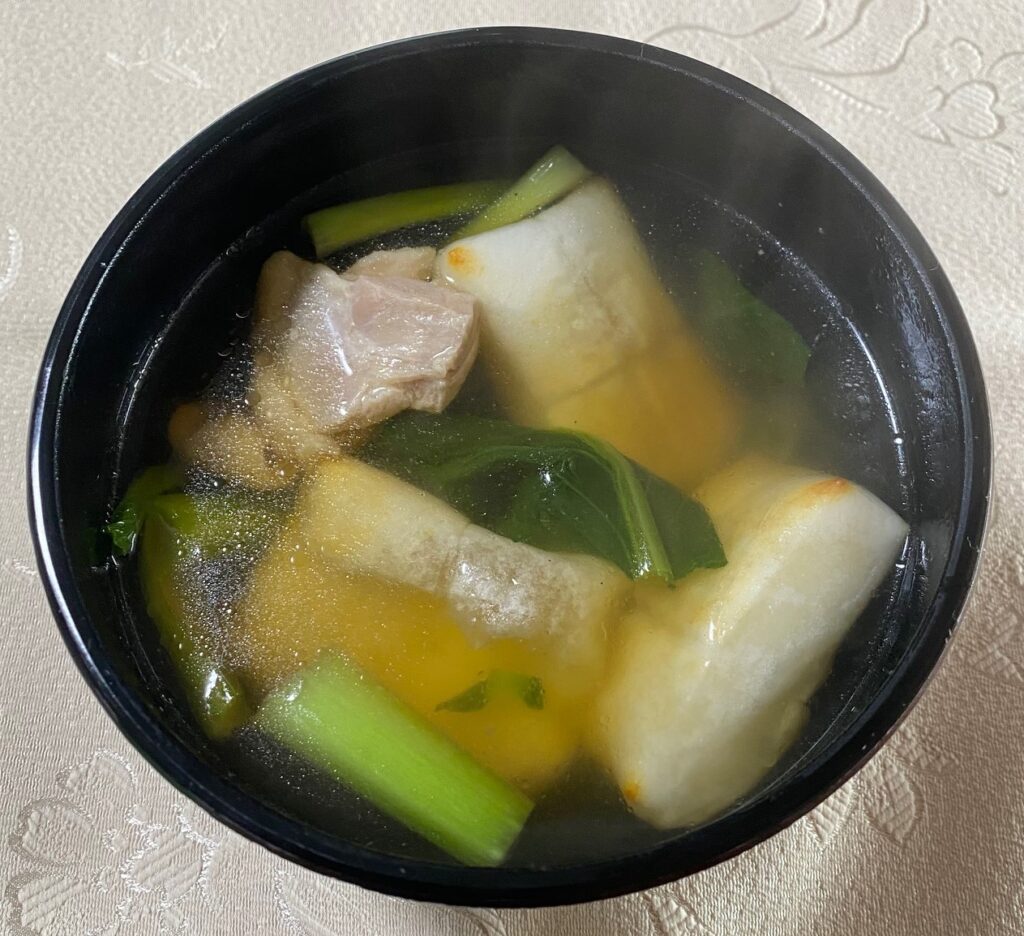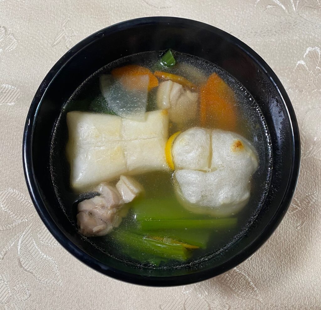 私が普通の日の昼食のために作る雑煮は、その日ある野菜を入れた餅入り澄まし汁である。
